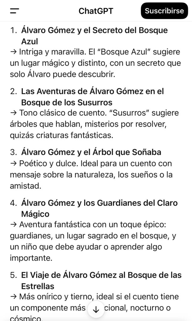 Nombre del personaje principal: «Sugiere 5 títulos que incluyan el nombre de mi protagonista, Álvaro Gómez. Es un cuento infantil ambientado en un bosque mágico»