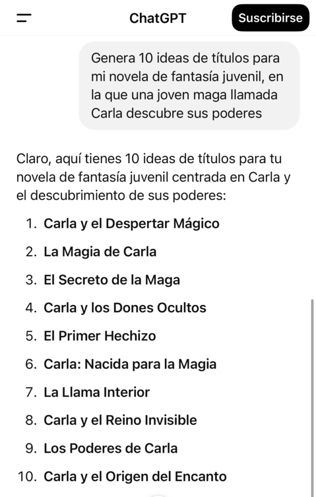 Puedes asignar a ChatGPT la siguiente tarea para crear un título: «Genera 10 ideas de títulos para mi novela de fantasía juvenil, en la que una joven maga llamada Carla descubre sus poderes.»