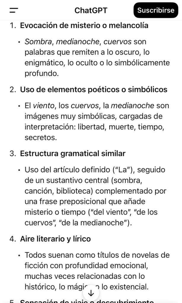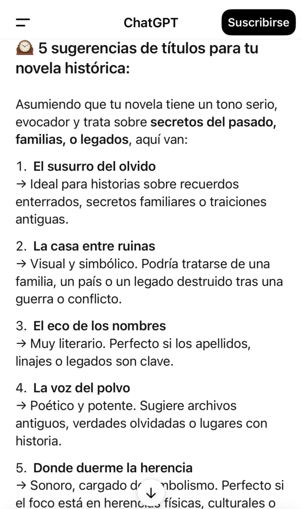 Otra posibilidad es utilizar la inteligencia artificial para analizar títulos de libros ya publicados en tu género. Herramientas como ChatGPT pueden ayudarte a identificar los elementos clave que hacen que estos títulos sean especialmente atractivos y efectivos para el lector. Proporciona a la IA algunos ejemplos de títulos que te resulten llamativos y pregúntale qué los hace tan eficaces. Después, puedes pedirle sugerencias de títulos para tu libro que sigan patrones similares, mejorando así su impacto y visibilidad en tiendas online o buscadores.
