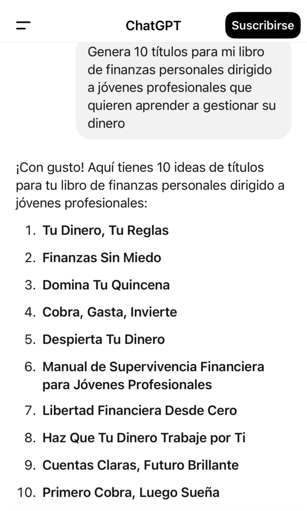 También puedes probar con la siguiente idea: «Genera 10 títulos para mi libro de finanzas personales dirigido a jóvenes profesionales que quieren aprender a gestionar su dinero.»