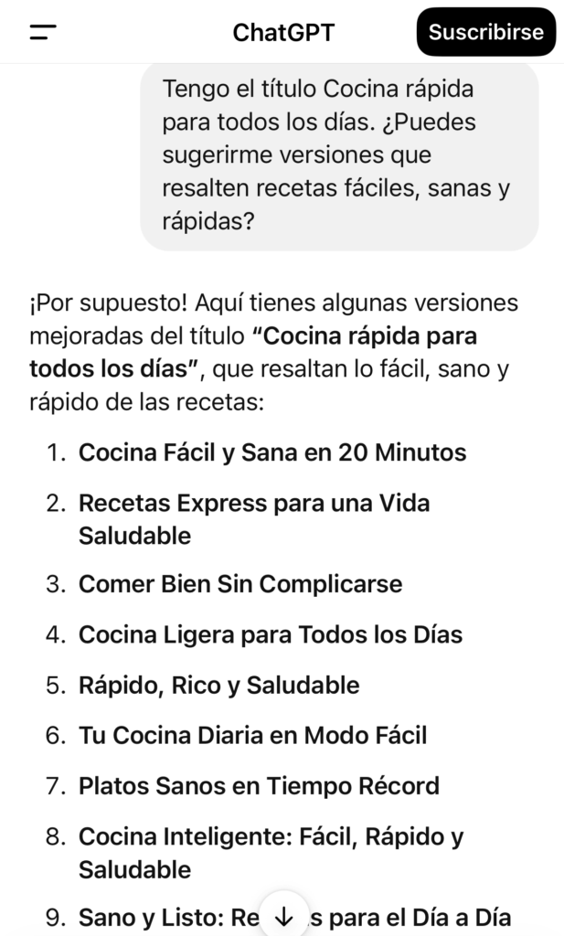 O también puedes utilizar: «Mi título actual es Cocina rápida para cada día. ¿Puedes sugerirme versiones que resalten recetas fáciles, sanas y rápidas?»