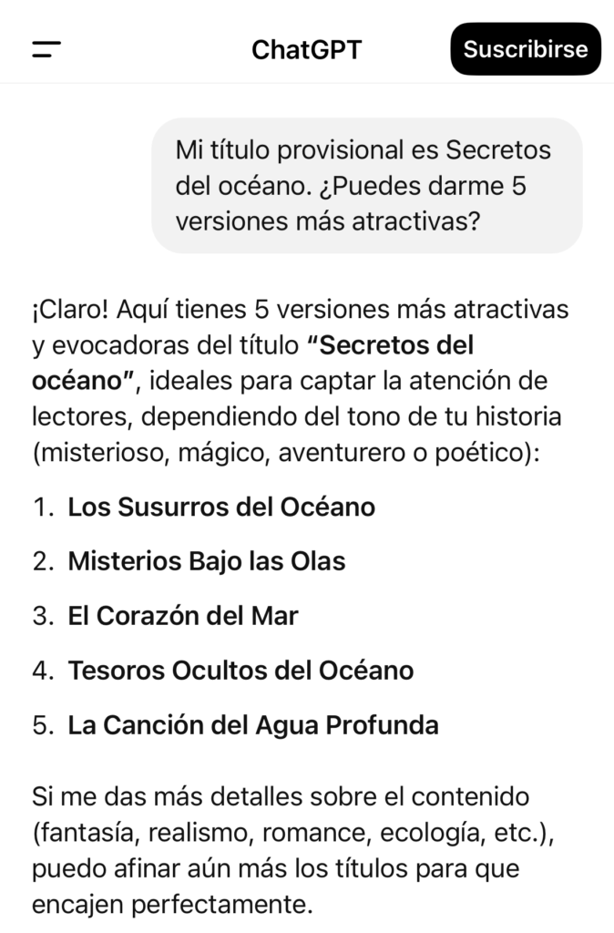 Podrías darle esta indicación: «Tengo como título provisional Secretos del océano. ¿Puedes darme 5 versiones que suenen más atractivas?»