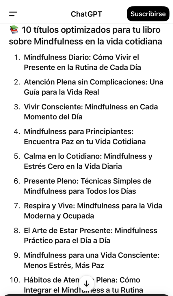 «Mi libro trata sobre Mindfulness en la vida cotidiana. ¿Qué palabras clave mejorarían su visibilidad en plataformas para publicar libros? Propónme 10 títulos optimizados.«