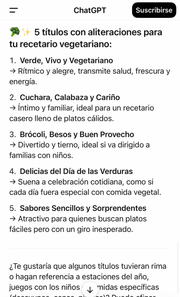 Juego de palabras y aliteraciones: «Sugiere 5 títulos con aliteraciones para un recetario vegetariano. Debe sonar acogedor y divertido, ideal para familias.»
