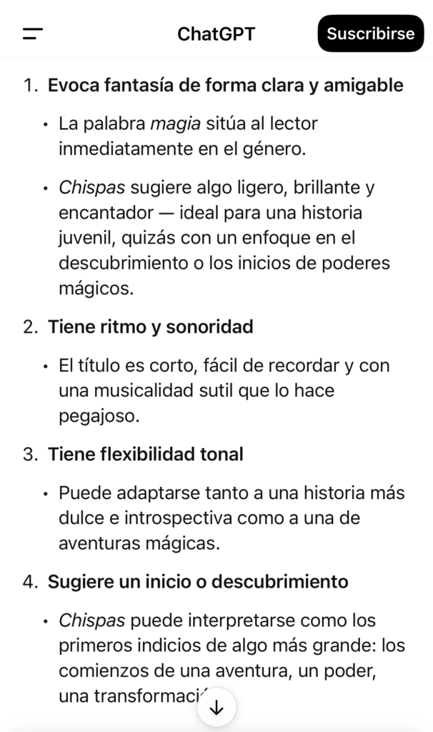 «Mi título actual es Chispas de magia. ¿Puedes analizar cuáles son los puntos fuertes y débiles de este título? ¿Encaja con el género de fantasía y con el público objetivo de entre 14 y 18 años?»