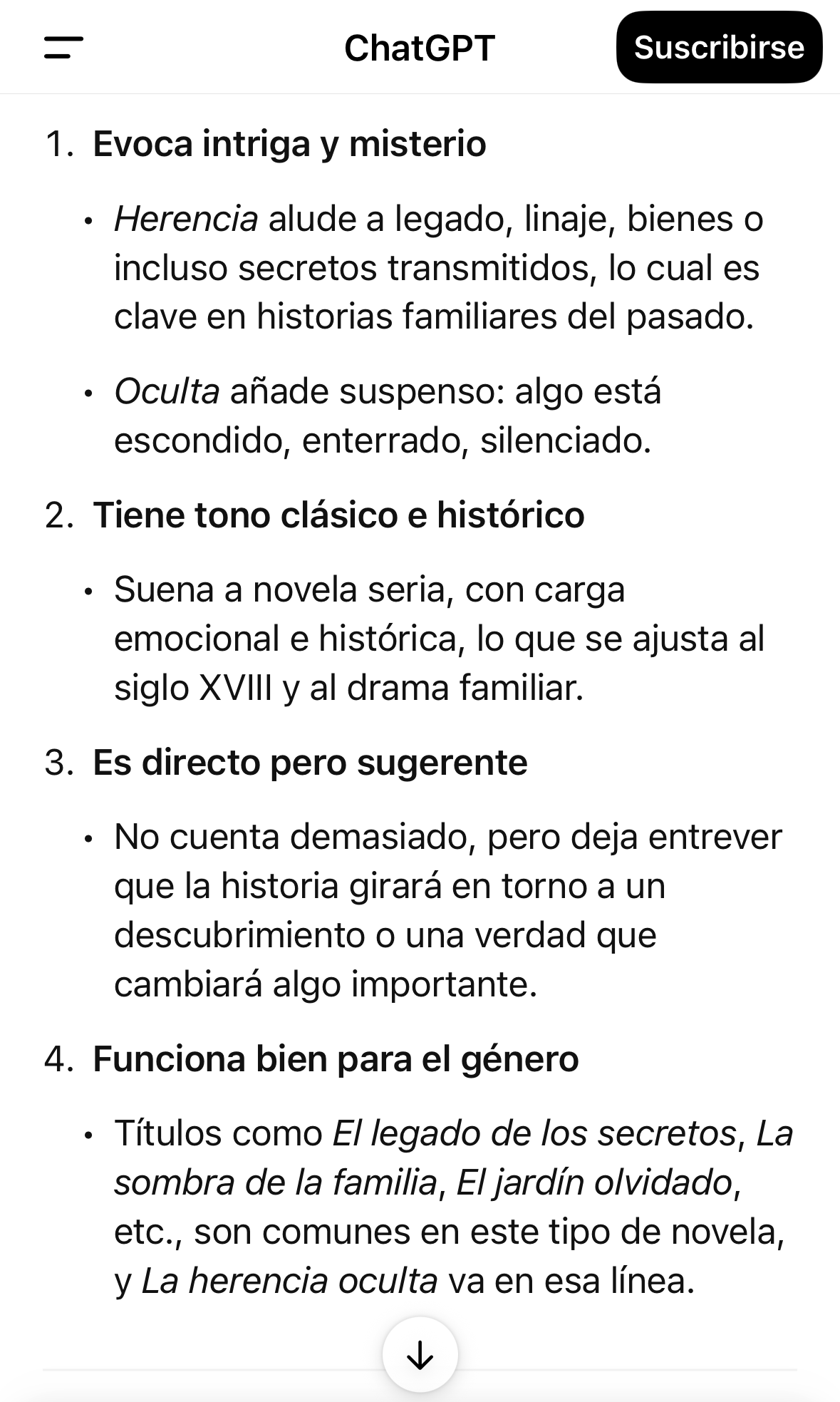 «Mi título actual es La herencia oculta. ¿Puedes analizar qué tan bien encaja este título con mi novela histórica ambientada en el siglo XVIII, que trata sobre el descubrimiento de un secreto familiar?»
