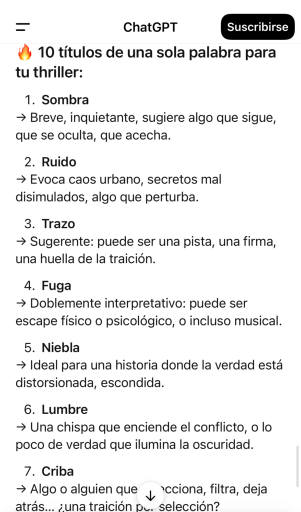 Título de una sola palabra: «Sugiere 10 títulos de una sola palabra para mi thiller ambientado en una gran ciudad y que trate sobre traición. El título debe generar tensión y reflejar una atmósfera oscura.»